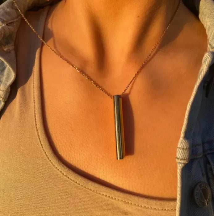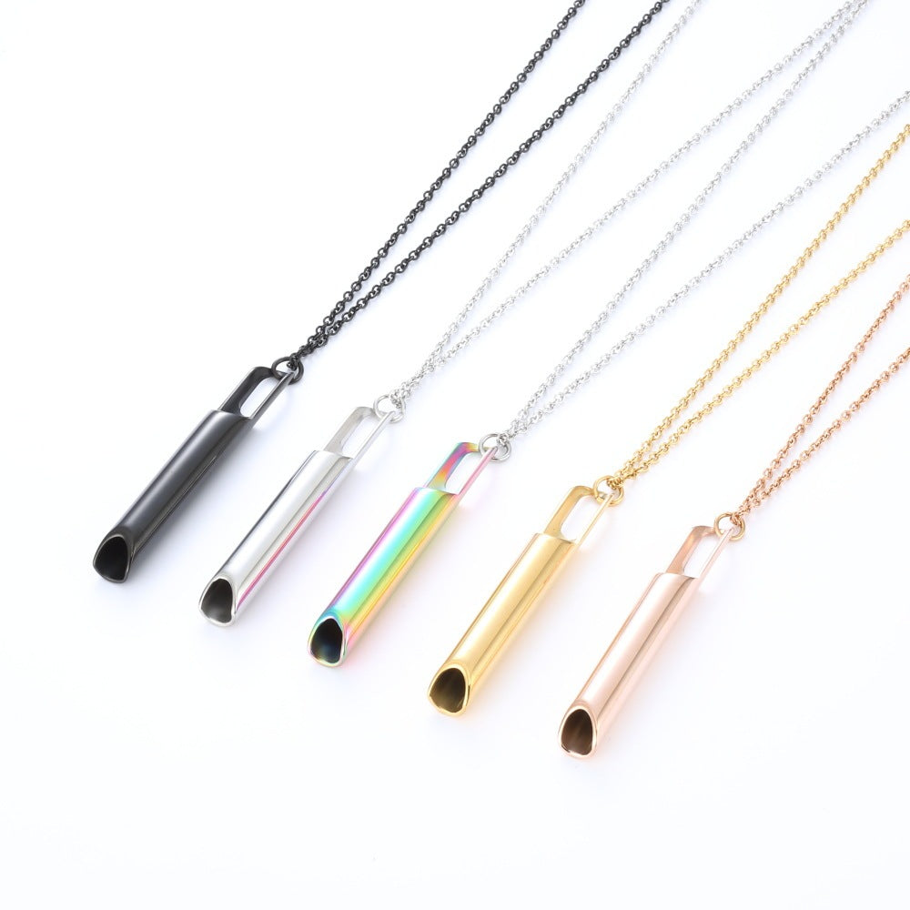 Detta andningshalsband är mer än ett smycke – det är ett verktyg för lugn, fokus och självkontroll i vardagen. Den snidade visselpipan i allergivänligt titanstål hjälper dig att hitta tillbaka till lugnet genom kontrollerad andning – var du än är.